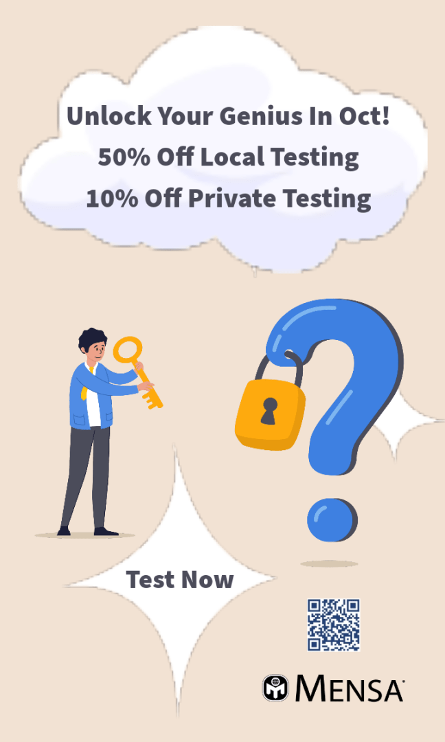 50% off Local Group Mensa Admissions Testing and 10% off Private Mensa Admissions Testing in October
